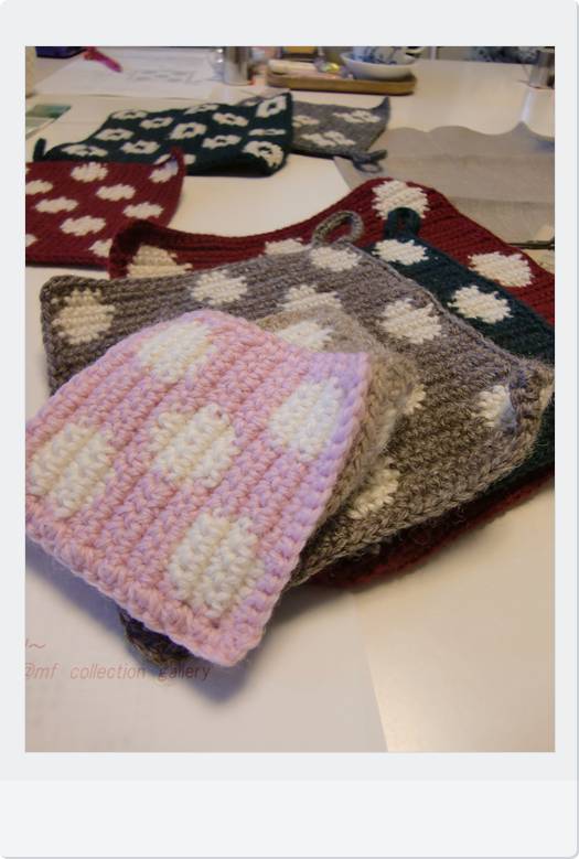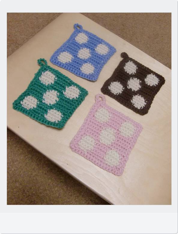 ↑念願の水玉コースターが編めました。
