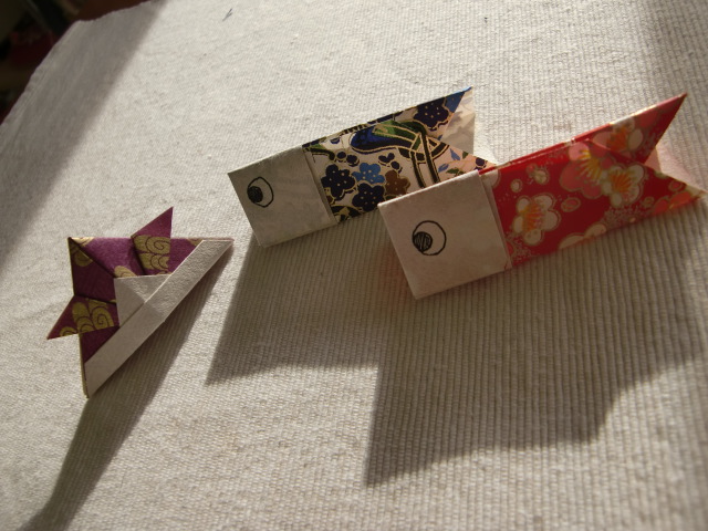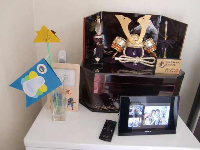 じいじばあばからの兜と、保育園で作っていただいた鯉のぼり(ヒレが手形足形になっていて、かわいいです)。