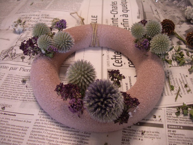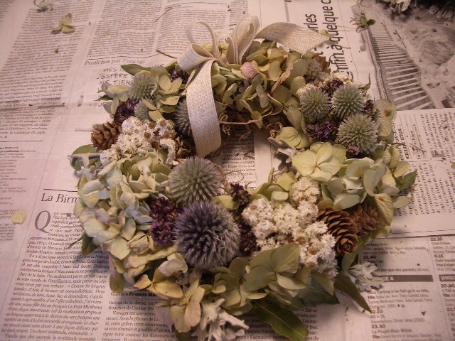 その後、菊の花、オーデコロンミント、松ぼっくり、月桂樹、白妙菊、あじさいで埋めていきます。