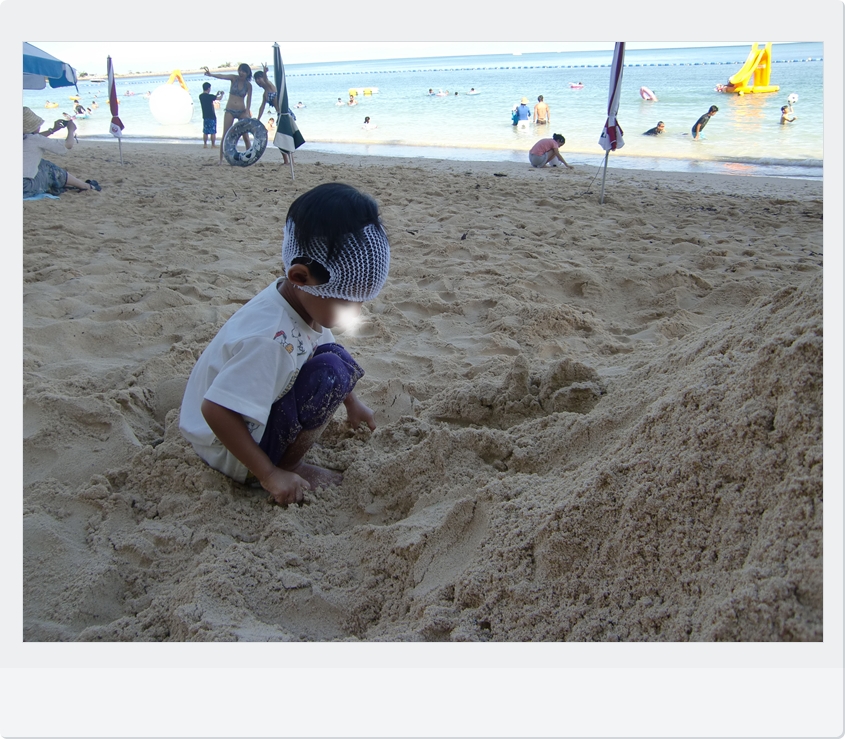 3日目は、朝食後、プライベートビーチの砂浜で砂遊び。